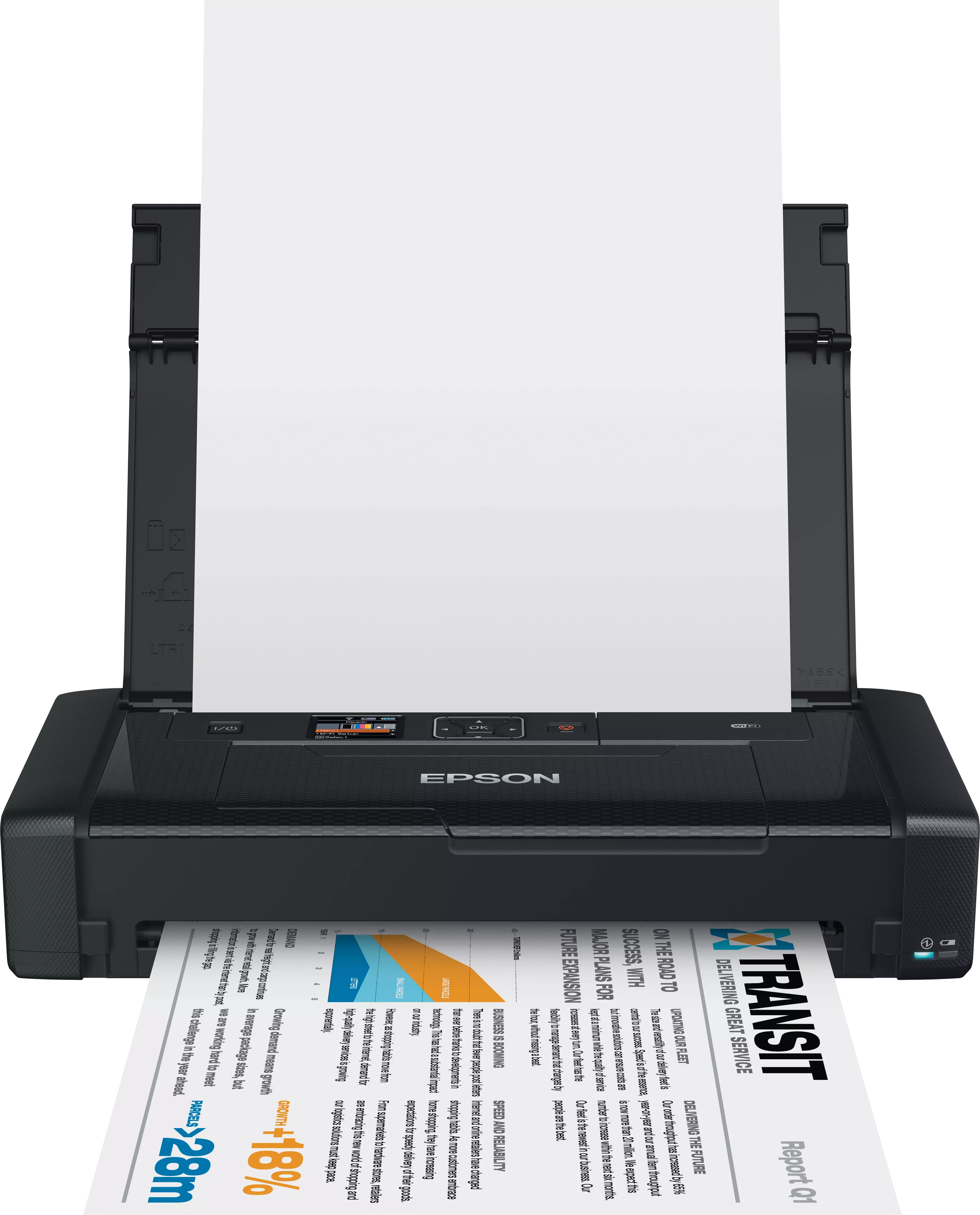Aceasta este imprimanta portabilă pe care o aşteptaţi. Prima imprimantă A4 portabilă, produsă vreodată de Epson, este excelentă pentru specialiştii care trebuie să imprime de la distanţă facturi, contracte şi multe altele. Fiind mică şi uşoară, această imprimantă cu jet de cerneală este echipată cu un acumulator integrat, un ecran LCD, conectivitate Wi-Fi şi Wi-Fi Direct® şi este compatibilă cu Apple AirPrint, Google Cloud Print şi Epson iPrint.